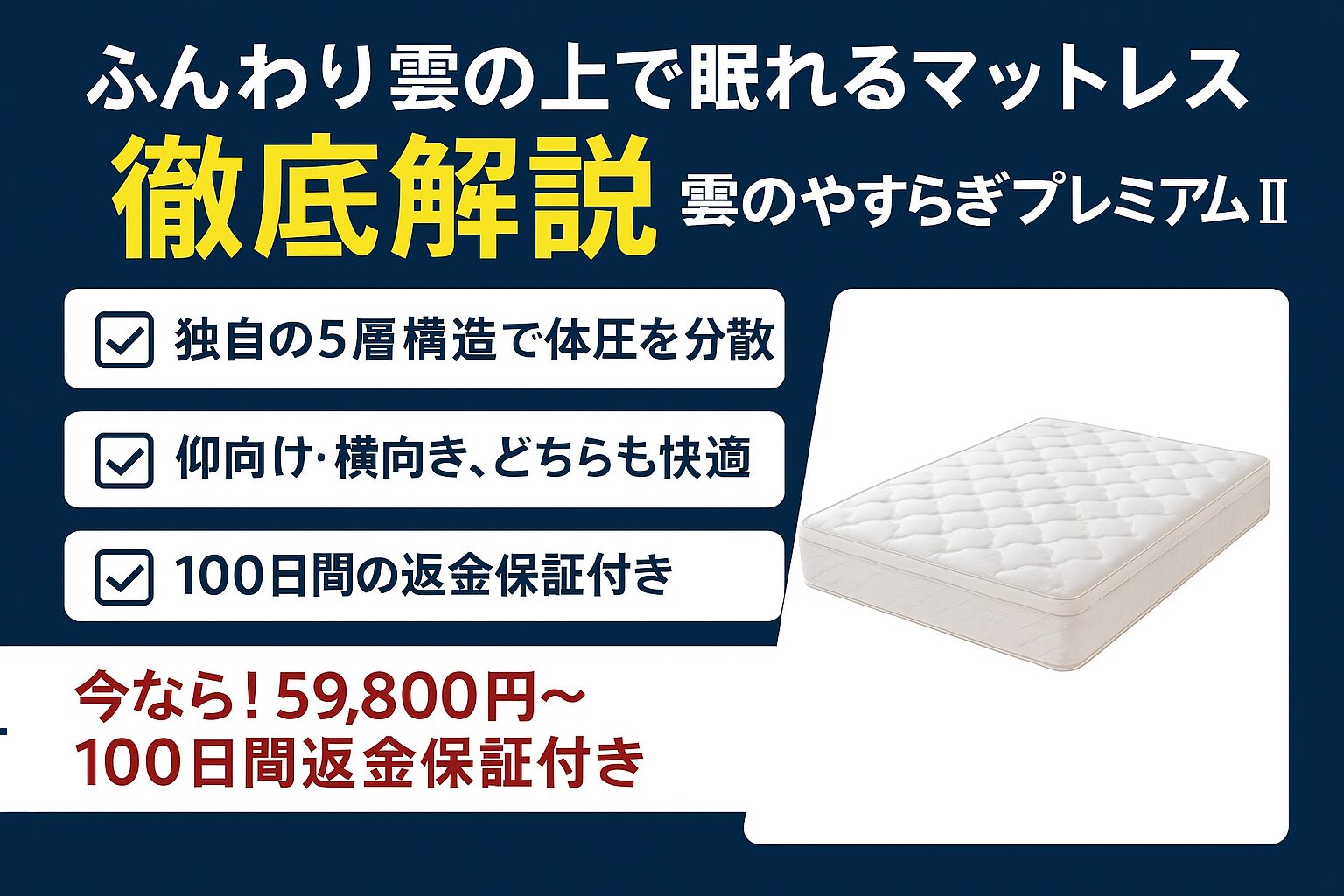 雲のやすらぎプレミアムⅡ | 高反発+低反発(5層) | 体圧分散・腰痛対策・リバーシブル | 約¥59,800〜 | 柔らかさと反発のバランス | ◎ | ○ | 100日返金保証 |